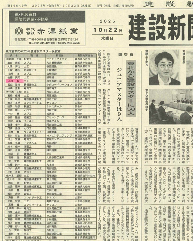 一覧へ戻る 弊社職員が、国土交通大臣顕彰を受賞しました。2025-10-28チェック 2025年度の優秀施工者国土交通大臣顕彰が発表され、東北管内では建設マスターに50人が選ばれました。弊社職員の小原智が、県知事表彰に引き続き今年は国土交通大臣顕彰を受賞し、東京都で行われた表彰式に参列して参りました!建設マスターとは:建設産業の第一線でものづくりに励み、優秀な技術・技能を身に付けて後進の指導にも貢献している技能者を指します。